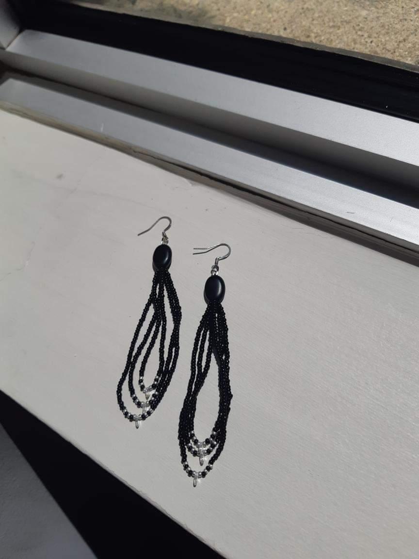 Made with shaped obsidian beads, black 11/0 Czech seed beads, genuine sterling silver plated 11/0 Miyuki beads, and iridescent dragon scale drop beads, this collection is made with materials as luxurious as the vast expanses of sky.